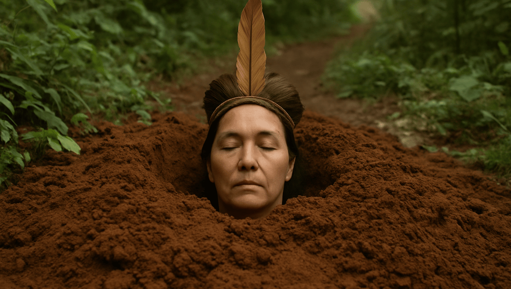 Em algumas tradições de retiros espirituais, especialmente os de inspiração xamânica, indígena ou de medicina da floresta, existe um ritual profundo e simbólico conhecido como “A Terra Me Pariu”. Nele, participantes são enterrados vivos até a altura do pescoço, com acompanhamento espiritual, como forma de renascimento energético, purificação emocional e reconexão com a essência da Terra.