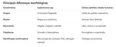 A diferenciação entre Lophomonas spp. e células epiteliais ciliadas humanas é um dos maiores desafios no diagnóstico microscópico de infecções respiratórias. Ambas apresentam semelhanças morfológicas marcantes, especialmente em amostras de lavado broncoalveolar (LBA), o que pode levar a erros de interpretação mesmo por profissionais experientes.